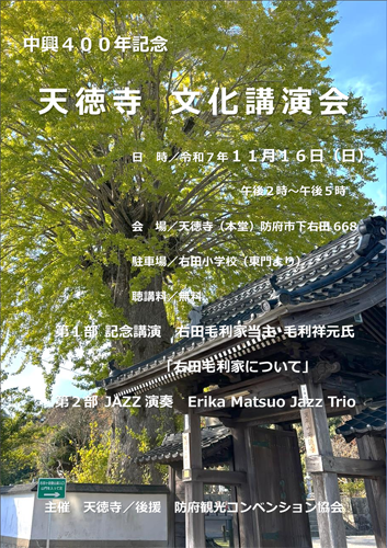 今年はちょうど中興400年の記念の年にあたり、11月16日(日)午後2時〜5時、「天徳寺文化講演会」を企画いたしました。
